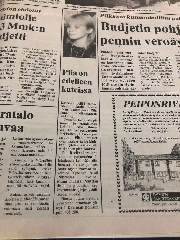 Sain keväällä puhelun Ylen toimittaja Marko Niemeltä. Hän kertoi tekevänsä juttua piikkiöläisen 15-vuotiaan Piia Ristikankareen selittämättömästä katoamisesta yli kolmekymmentä vuotta sitten, lokakuussa 1988. Niemi oli saanut silloiselta Kunnallislehden päätoimittaja Ville Pohjoselta vinkin kysyä, mitä minä muistan tapauksesta.