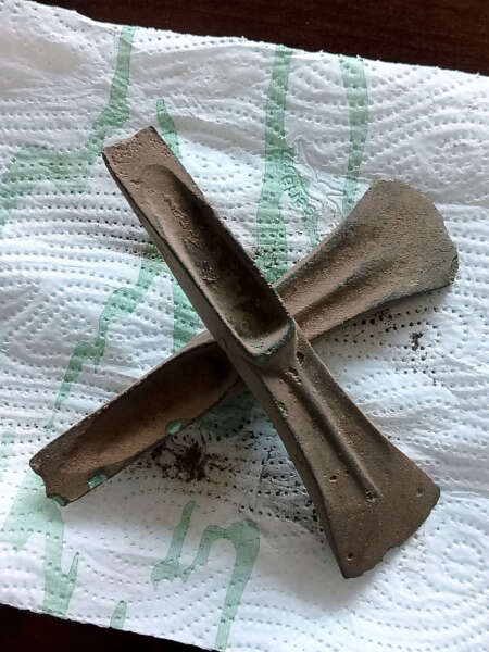 Ja niin lopulta kävikin. Halla-ahon metallinetsin havaitsi aivan pronssikautisen asuinpaikan tuntumasta metalliesineen, ja pian esille lapioituna oli kaksi pronssista kirveenpäätä.
