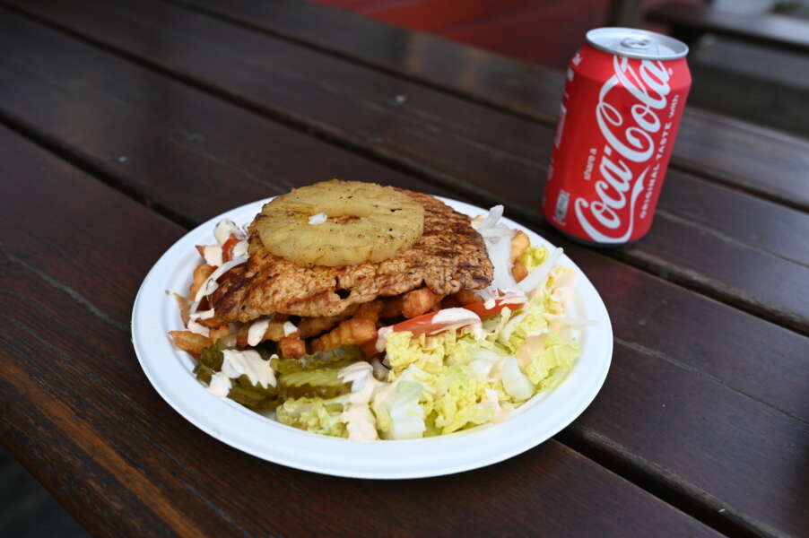 Putte Possu oli maittava, havaijinleikkeen tapainen annos. Ranskalaiset olivat ehkä hitusen liian rapsakat, mutta valkosipulimajoneesi kompensoi kokonaisuuden tasapainoiseksi. Nälkä pysyi poissa iltaan asti. Kuva: Eveliina Portnoj